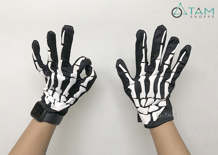 Găng tay in xương trắng phối hợp cùng áo choàng xương và mặt nạ ấn tượng...