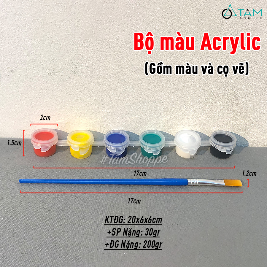- Một vỉ gồm 6 màu Acrylic cơ bản: Đen, trắng, đỏ, vàng, xanh dương, xanh lá. Tặng kèm 1 cọ vẽ