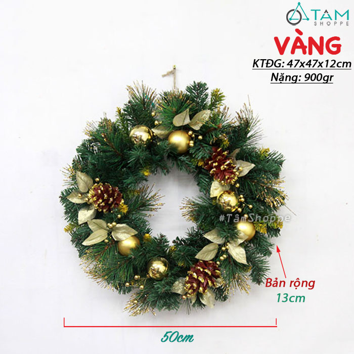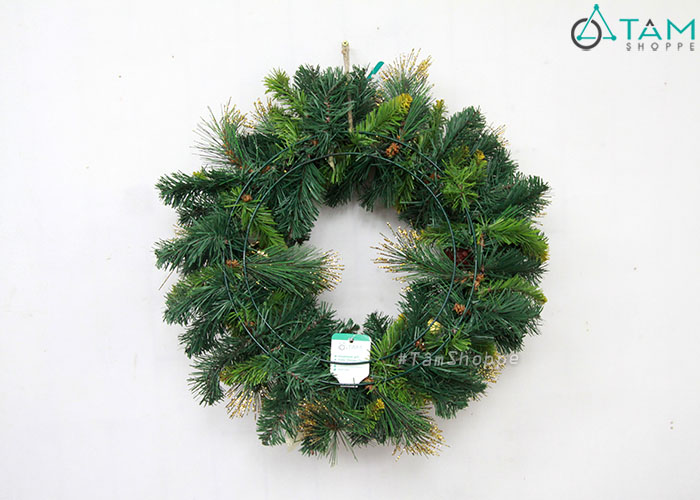 + Vòng lá thông 3 loại lá kết hợp cùng nhau được kết trên khung sắt chắc chắn. Phủ kim tuyến lấp lánh đẹp mắt